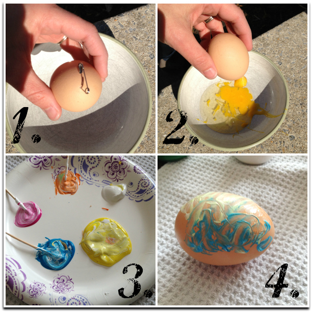 Then I grabbed a safety pin. Here’s where you have to be careful. I poked a small(ish) hole in one end of the egg (this one is the side you blow on) and a slightly larger hole in the opposite side (that’s the side the yolk comes out). The kids were kind of in awe at first and then they were kind of grossed out and then they were in awe again when they felt how light the egg shell was when the yolk and white were gone! <- Don’t worry, I didn’t toss the yoks and whites. I made a quiche! Though you don’t have to, I always give them a quick rinse and swish and then let them dry.