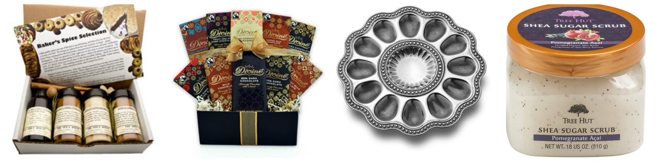 We would like to give a huge thank you to the companies that made this give away possible. Thank you to John Boos for the beautiful maple cutting board, The Spice House for their spice and baking gift sets, Divine Chocolate for their luxuriously rich Fair Trade Chocolate gift basket, Wilton Armetale for the elegant egg plate, and Tree Hut for the body scrub and lotion.