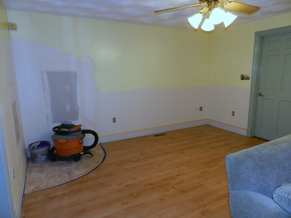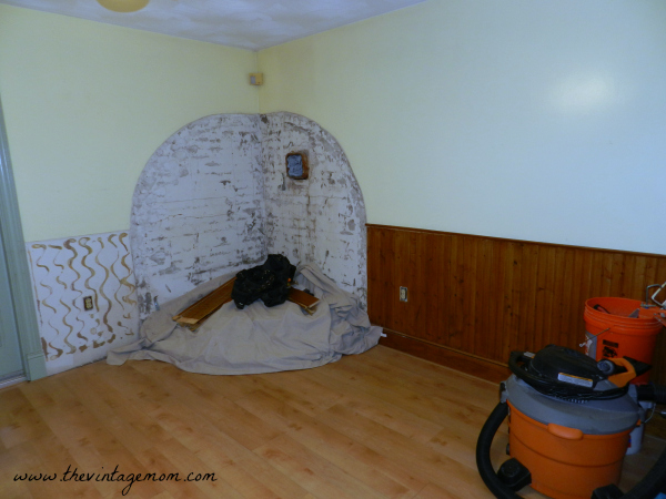 First we hired a contractor. Let me tell you, it is no small feat to find a good and honest contractor. Man, I wish we had some of our peeps back from PA. We had to start over here. There were no shows for estimates, estimates blown totally out of proportion because the contractor was busy…it was bad. Finally we settled on a contractor that we felt comfortable with. George from Bristol County Remodeling started last Monday and within a few days, the coal stove that was set in brick was out. The wood paneling was off, walls were patched, and progress was made!