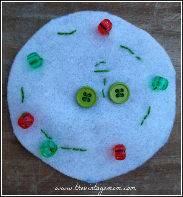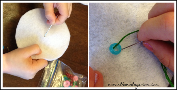 3. Separate the two circles. Your kiddo will work on one at a time. Decorating the first one, add buttons, beads, or even just embroidering with a special creative stitch.