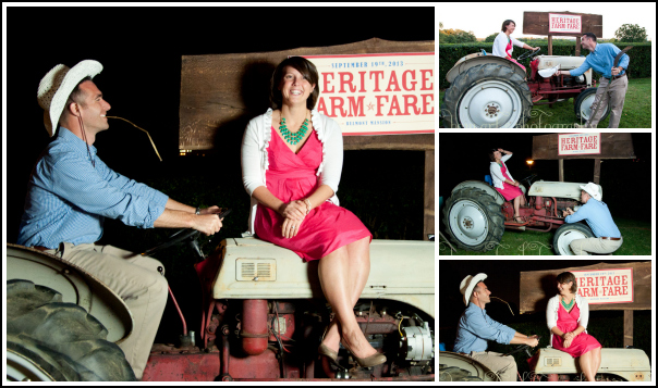 By this point, Ben and I couldn’t hold any more and we headed over to a table to sit and eat before we started Round 2. As we sat, we did something very important. We brainstormed. There was a photographer, Beth Malonoski from BCM art and Photography, taking pics, photo booth style with a tractor and other farm implements as props. We planned out our strategy, the pics we would take. We decided on Ben tipping his hat to me, my favorite…Ben fixing my tractor while I looked exasperated, and other fun poses.