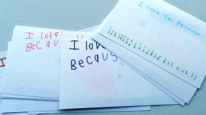 Step 3: Write down all the reasons you love the person, one per card. My daughter just started learning to write, so she was adamant about doing the writing herself. My son on the other hand would draw a