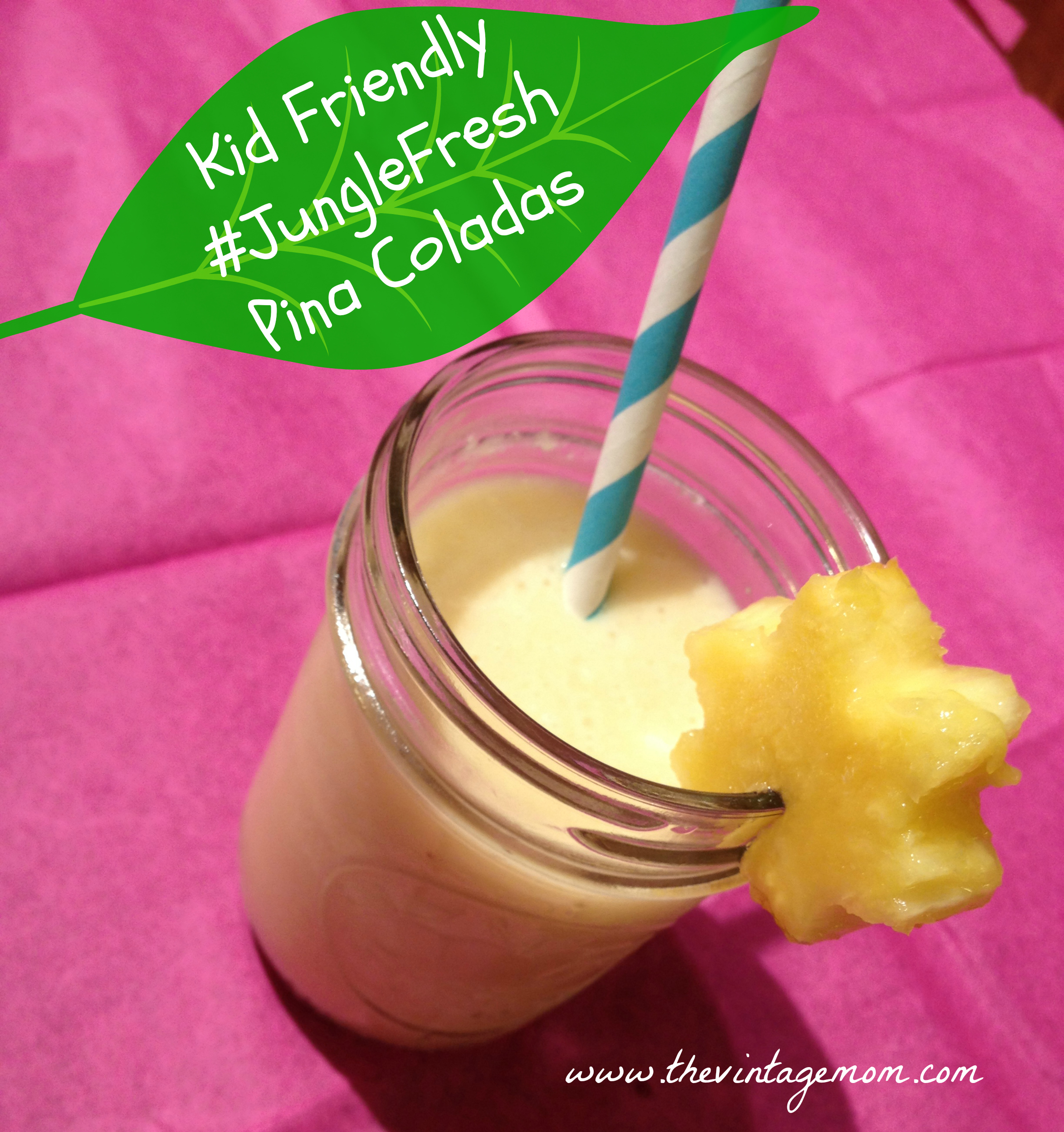 We had tons of options but our eyes were on the ingredients for the perfect Kid Friendly Pina Colada! I was pretty excited to crack my own coconut and the kids were pretty excited to see it! So bananas, pineapple, and a coconut later (okay and some other treats) we were headed home. The next day was a long day of anticipation for those kiddos BUT we were expecting a snowstorm that night. What better time is there to have a #JungleFresh party with pina coladas than during snowstorm #407 of the year? Perfecto!