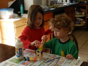 I plan (haha, no implementation yet) on mounting a few of the smaller “can’t part with” pictures on 12×12 pages for the scrapbook. I think it will be fun to watch the kids coloring / painting skills grow as they do in the pictures