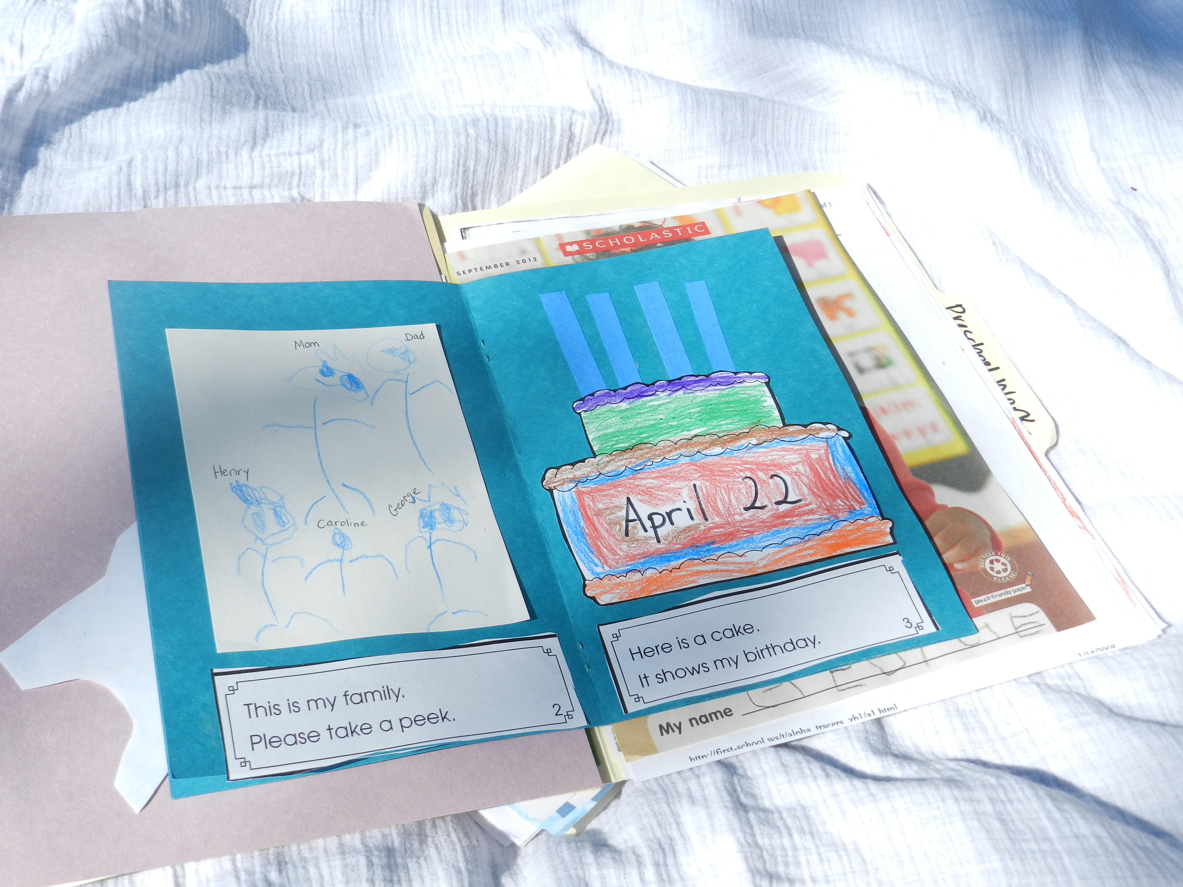 When papers came home from school, we talked about them at dinner time, giving C and G’s dad a chance to see everything that they had worked on and be a part of the stories that go along with it. Then, those crafts and papers went in their respective folder. This folder is kept in a central location where it is easy for me to add things to it on a daily basis.